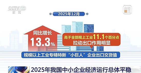 • 出口方面保持强劲势头。2025年12月,中小企业出口指数为52.4%,连续21个月处于扩张区间。规模以上工业专精特新“小巨人”企业出口交货值同比增长13.3%,高于全部规上工业11.1个百分点,拉动出口作用明显。
