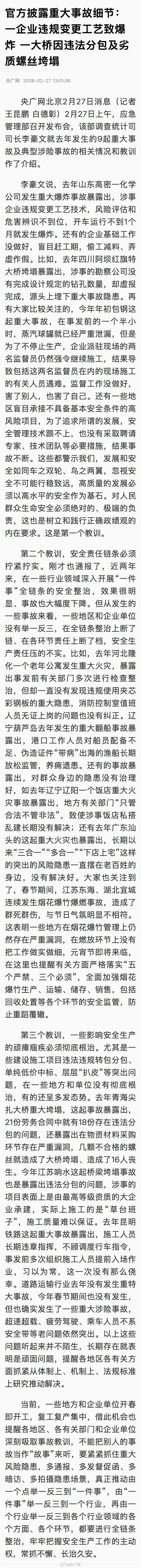 【官方披露重大事故细节:#青海尖扎大桥因违法分包及劣质螺丝垮塌#】#基建安全对草台班子零容忍#2月27日上午,应急管理部召开发布会,该部调查统计司司长李豪文就去年发生的9起重大事故及典型涉险事故的相关情况和教训作了介绍。其中提到,去年青海尖扎大桥重大垮塌,这起事故暴露出,21份劳务合同中就有18份存在违法分包的问题,还暴露出在物资材料采购环节存在严重漏洞,几颗不合格的螺丝就造成了大桥垮塌、造成了16人丧生。详情↓(记者王昆鹏 白德彰)
