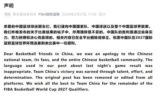 亲爱的中国篮球球迷朋友们,我们谨向中国国家队、中国球迷以及整个中国篮球界致歉。我们昨晚发布的关于比赛结果的帖子中,所用措辞是不妥的。中国队的胜利是通过自身实力、努力拼搏和决心而赢得的。相关内容已在全平台删除或修正。祝愿中国队在2027国际篮联篮球世界杯预选赛剩余比赛中一切顺利。