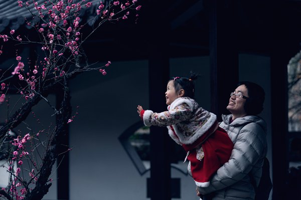 梅香溢庭园,稚子探春色。粉蕊缀枝,暗香浮动,孩童在亲人怀中伸手追向繁花,眉眼间满是对春日的欢喜。一长一幼,一花一笑,定格美好春光。(安徽省来安县纪委监委供  李桂芳 摄)