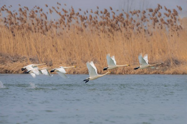 二月的江苏省高邮市高邮湖湿地,越冬大天鹅陆续开启北迁之旅。图为在水面滑翔、振翅高飞的大天鹅。(江苏省高邮市纪委监委供 周启付 摄)