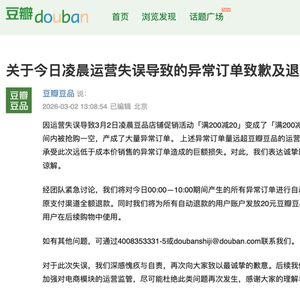 3月2日,豆瓣发布关于今日凌晨运营失误导致的异常订单致歉及退款说明: