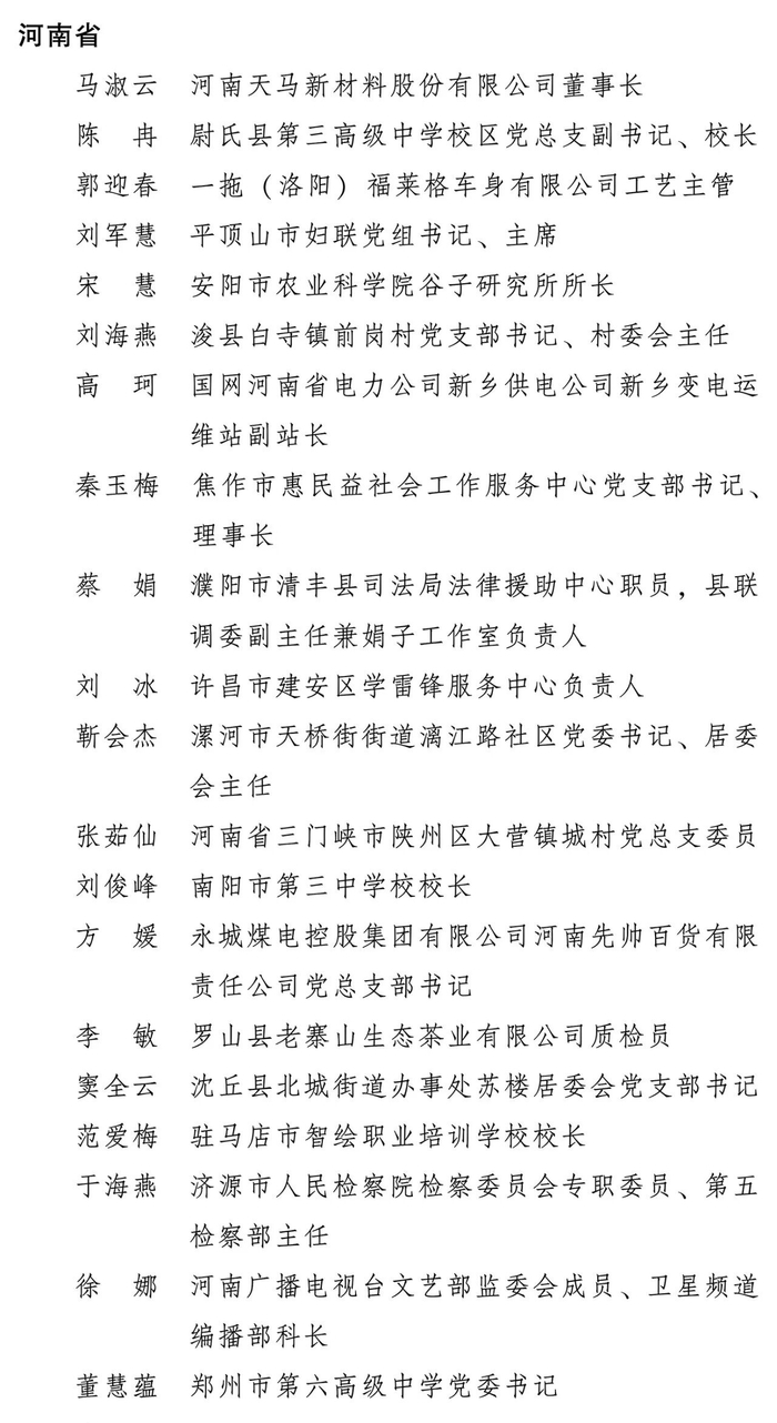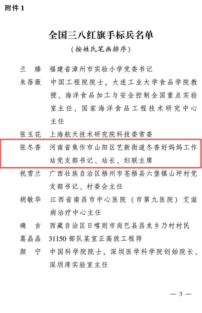 其中,河南有1人被授予全国三八红旗手标兵称号,20人被授予全国三八红旗手称号,12个单位被授予全国三八红旗集体称号,29个单位被授予全国巾帼文明岗称号。(郭栩汝 王靖)