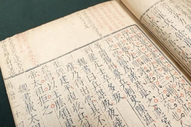 顾青介绍,馆藏的《三国志》是明代南京国子监万历二十四年的刊刻版本,作为明代官方刻书机构的精品之作,这部古籍的珍贵之处首先在于它的书板渊源。刻书所用的书板从宋代流传而来,历经元、明两代多次修复沿用,是难得的古代官刻善本。更难得的是,这部书还是清代著名文献学家何焯的亲笔批校本,书页上留有其朱墨批注,并为清代名臣刘墉,也是人们俗称的“刘罗锅”旧藏。集珍贵版本、名家批注、名人收藏于一身,这部古籍更具历史与文献价值。