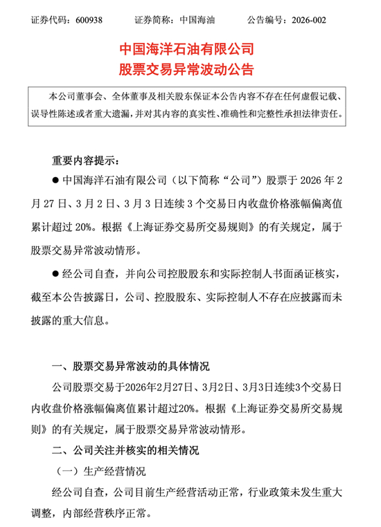 中国海油发布公告称,股票交易于2026年2月27日、3月2日、3月3日连续3个交易日内收盘价格涨幅偏离值累计超过20%。根据《上海证券交易所交易规则》的有关规定,属于股票交易异常波动情形。