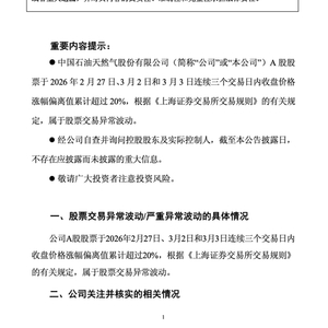 中国石油发布公告称,公司A股股票于2026年2月27日、3月2日和3月3日连续三个交易日内收盘价格涨幅偏离值累计超过20%,根据《上海证券交易所交易规则》的有关规定,属于股票交易异常波动。