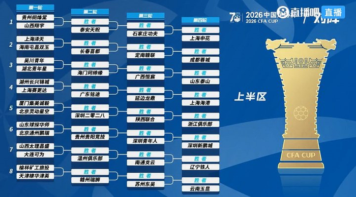 直播吧03月04日讯 2026赛季中国足协杯第一次(第1-4轮)抽签结果出炉,今年恰逢足协杯70周年,一共80队参赛。中甲球队第3轮登场,中超球队第4轮登场。
