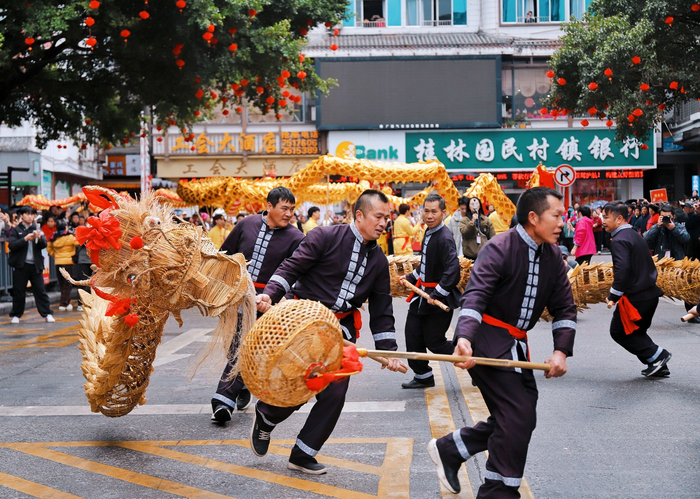 一雷惊蛰始,千祥草木荣。在龙胜县龙胜镇十字街,金色草龙在街巷翻腾,承载着五谷丰登的期盼,更映照出奋进的姿态。(龙胜各族自治县纪委监委供 石建华/摄)