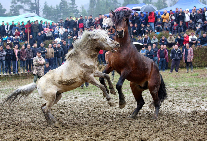 惊蛰到,祈丰收。融水苗族自治县安太乡元宝村整垛苗寨举行斗马比赛,祈求风调雨顺、五谷丰登。图为两匹勇驹在该县安太乡元宝村整垛苗寨进行激烈的厮打。(融水苗族自治县纪委监委供 龙林智/摄)
