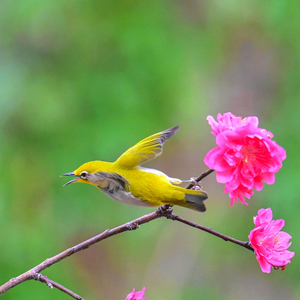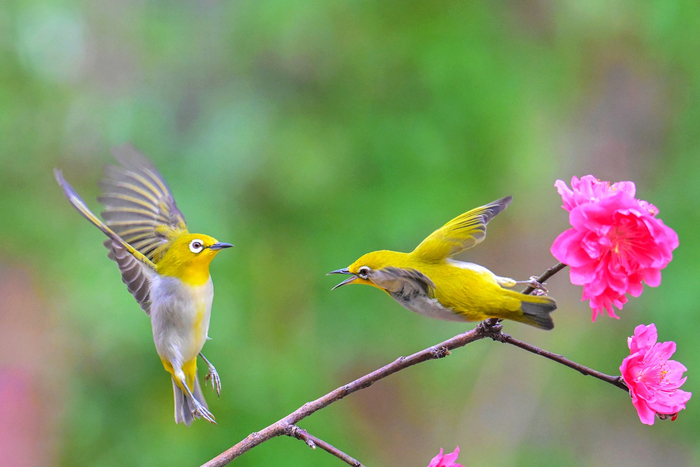 惊蛰时节,春雷初醒,八桂大地春意渐浓。北流市会仙河公园的花枝间,两只绣眼鸟振翅嬉戏,黄羽轻扬,与艳红的花簇相映成趣,勾勒出惊蛰时节万物萌动、灵动鲜活的生态图景。(北流市纪委监委供 苏建林/摄)