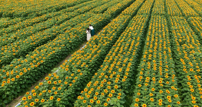 惊蛰至,春意浓。走进田东县祥周镇百渡村,连片的向日葵正值盛花期,金黄的花盘迎着暖阳绽放,吸引游客纷至沓来,在花海之中尽情观赏、游玩、拍照。(田东县纪委监委供 潘永杰/摄)