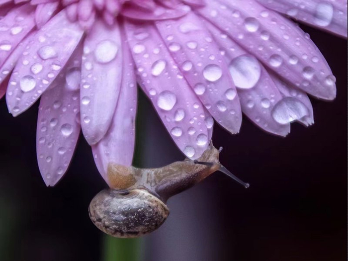 草木知四季,鸟虫感惊蛰。惊蛰时节,微雨初歇,容县口袋公园里的蜗牛攀上粉菊,在春意萌动里开启全新旅程。(容县纪委监委供 李清毅/摄)