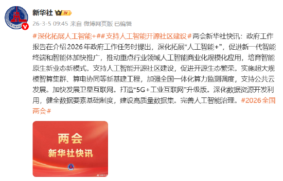 #深化拓展人工智能+##支持人工智能开源社区建设#两会新华社快讯:政府工作报告在介绍2026年政府工作任务时提出,深化拓展“人工智能+”,促进新一代智能终端和智能体加快推广,推动重点行业领域人工智能商业化规模化应用,培育智能原生新业态新模式。支持人工智能开源社区建设,促进开源生态繁荣。实施超大规模智算集群、算电协同等新基建工程,加强全国一体化算力监测调度,支持公共云发展。加快发展卫星互联网。打造“5G+工业互联网”升级版。深化数据资源开发利用,健全数据要素基础制度,建设高质量数据集。完善人工智能治理。#2026全国两会#
