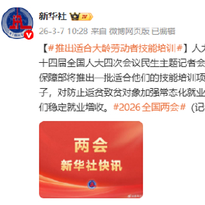 [推出适合大龄劳动者技能培训]人力资源社会保障部部长王晓萍3月7日在十四届全国人大四次会议民生主题记者会上表示,对于大龄劳动者,人力资源社会保障部将推出一批适合他们的技能培训项目,深化劳务协作,拓宽农民工就业路子,对防止返贫致贫对象加强常态化就业帮扶,对困难群体开展就业援助,帮助他们稳定就业增收。#2026全国两会#(记者:张晓洁、刘慧)