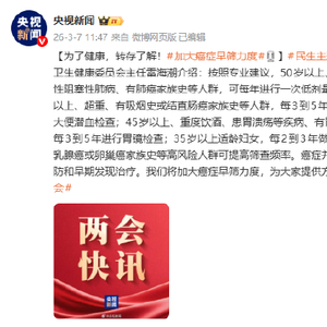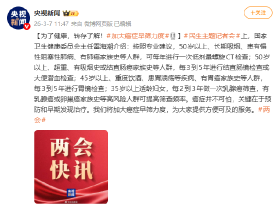 [为了健康,转存了解!#加大癌症早筛力度#[话筒]]#民生主题记者会#上,国家卫生健康委员会主任雷海潮介绍:按照专业建议,50岁以上、长期吸烟、患有慢性阻塞性肺病、有肺癌家族史等人群,可每年进行一次低剂量螺旋CT检查;50岁以上、超重、有吸烟史或结直肠癌家族史等人群,每3到5年进行结直肠镜检查或大便潜血检查;45岁以上、重度饮酒、患胃溃疡等疾病、有胃癌家族史等人群,每3到5年进行胃镜检查;35岁以上适龄妇女,每2到3年做一次乳腺癌筛查,有乳腺癌或卵巢癌家族史等高风险人群可提高筛查频率。癌症并不可怕,关键在于预防和早期发现治疗。我们将加大癌症早筛力度,为大家提供方便可及的服务。#两会#
