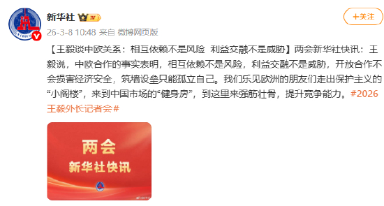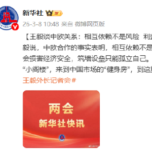 [王毅谈中欧关系:相互依赖不是风险 利益交融不是威胁]两会新华社快讯:王毅说,中欧合作的事实表明,相互依赖不是风险,利益交融不是威胁,开放合作不会损害经济安全,筑墙设垒只能孤立自己。我们乐见欧洲的朋友们走出保护主义的“小阁楼”,来到中国市场的“健身房”,到这里来强筋壮骨,提升竞争能力。#2026王毅外长记者会#