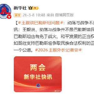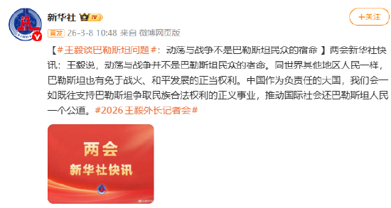 [#王毅谈巴勒斯坦问题#:动荡与战争不是巴勒斯坦民众的宿命 ]两会新华社快讯:王毅说,动荡与战争并不是巴勒斯坦民众的宿命。同世界其他地区人民一样,巴勒斯坦也有免于战火、和平发展的正当权利。中国作为负责任的大国,我们会一如既往支持巴勒斯坦争取民族合法权利的正义事业,推动国际社会还巴勒斯坦人民一个公道。#2026王毅外长记者会#