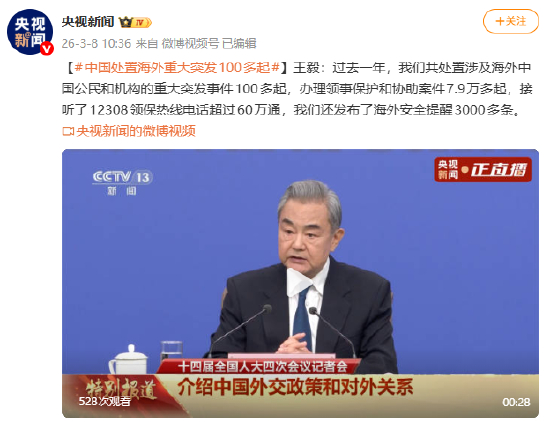 [#中国处置海外重大突发100多起#]王毅:过去一年,我们共处置涉及海外中国公民和机构的重大突发事件100多起,办理领事保护和协助案件7.9万多起,接听了12308领保热线电话超过60万通,我们还发布了海外安全提醒3000多条。