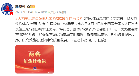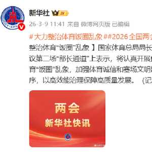 国家体育总局局长高志丹3月9日在十四届全国人大四次会议第二场“部长通道”上表示,将认真开展体育领域“深化治理年”行动,大力整治体育“饭圈”乱象,加强体育诚信和赛场文明建设,整肃赛风赛纪,规范行业发展秩序,以高效能治理保障高质量发展。(记者林德韧、于佳欣)