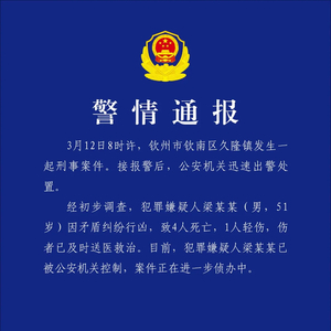 广西钦州市公安局钦南分局3月12日晚通报:3月12日8时许,钦州市钦南区久隆镇发生一起刑事案件。接报警后,公安机关迅速出警处置。