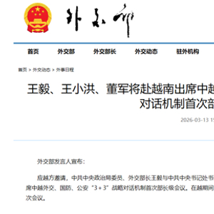 应越方邀请,中共中央政治局委员、外交部长王毅与中共中央书记处书记、公安部长王小洪,国防部长董军将于3月15日至17日赴越南出席中越外交、国防、公安“3+3”战略对话机制首次部长级会议。在越期间,王毅还将同越方领导人共同主持中越双边合作指导委员会第十七次会议。