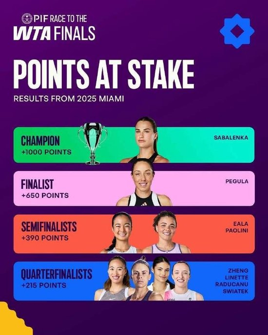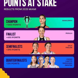 直播吧3月13日讯 WTA官方盘点了WTA1000迈阿密站的保分情况,其中卫冕冠军萨巴伦卡需要保住1000分,中国选手郑钦文、波兰名将斯瓦泰克需要保住八强的215分。