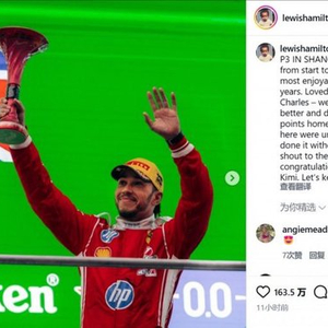 直播吧3月16日讯 F1中国站落下帷幕,法拉利车手汉密尔顿获得第三名,他赛后在社交媒体上感谢了中国车迷。