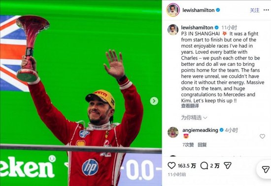 哈密尔顿写道:“在上海的P3!💥 这是一场从头到尾的恶战,也是我多年来跑得最尽兴的一场比赛。我非常享受与查尔斯(勒克莱尔)的每一次战斗——我们互相激励,变得更强,并竭尽所能为车队带回积分。”