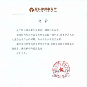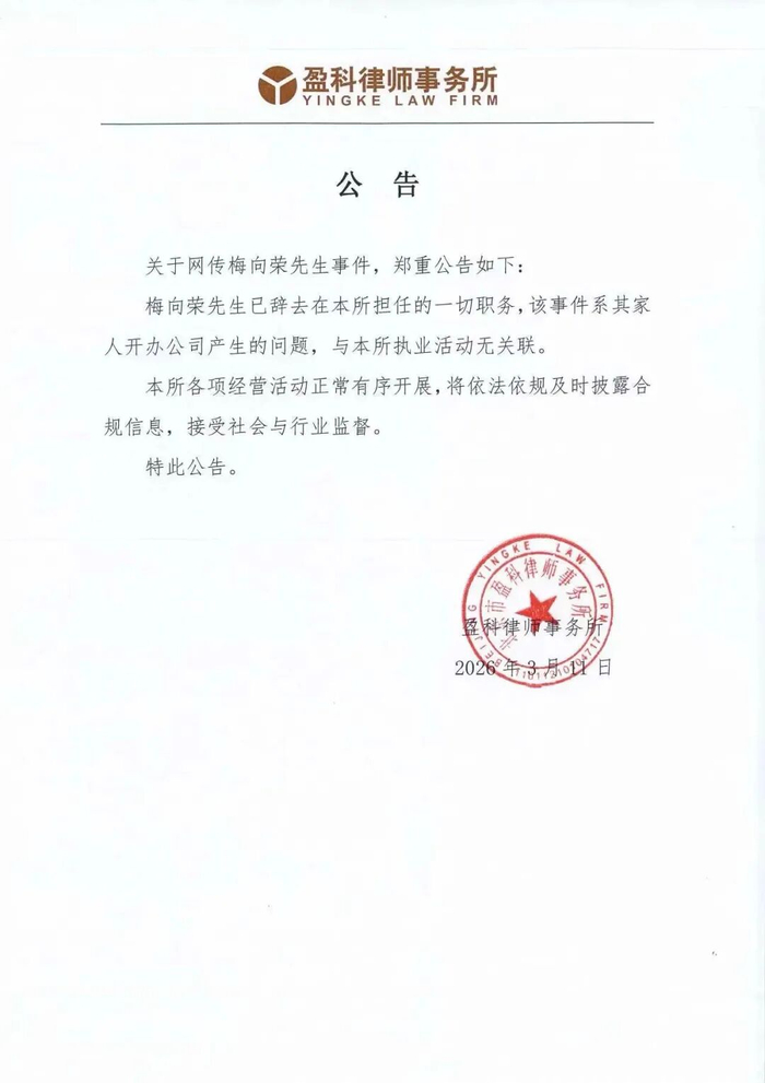 3月11日,北京市盈科律师事务所(下称“盈科律所”)掌门人梅向荣被指挪用律师费对外融资并违规担保的传闻迅速发酵,网传融资金额达到40亿元。当日夜间,盈科律所发布公告称,梅向荣已辞去在该所担任的一切职务,并表示:“该事件系其家人开办公司产生的问题,与本所执业活动无任何关联。”