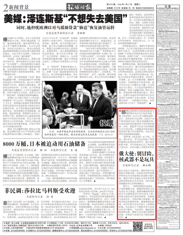 俄罗斯《消息报》16日称,目前,爱沙尼亚、罗马尼亚和波兰等国积极响应法国的谈判呼吁。俄大使利帕耶夫称,西方的政客忘记了核武器不是玩具,在此问题上采取轻率和冒险行动是不可接受的。俄科学院专家斯特凡诺维奇称,法国此举将导致俄罗斯和北约在黑海地区的战略力量失衡。俄将不得不加强在克里米亚部署远程导弹和防空反导系统,同时加强黑海舰队的打击和防御能力。