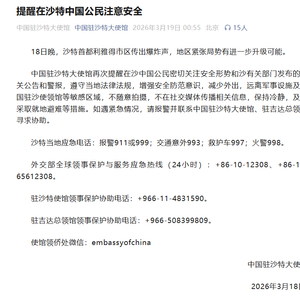中国驻沙特大使馆再次提醒在沙中国公民密切关注安全形势和沙有关部门发布的相关公告和警报,遵守当地法律法规,增强安全防范意识,减少外出,远离军事设施及外国驻沙使领馆等敏感区域,不随意拍摄,不在社交媒体传播相关信息,保持冷静,及时采取就地避难等措施。如遇紧急情况,请报警并联系中国驻沙特大使馆、驻吉达总领馆寻求协助。