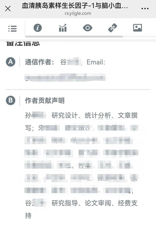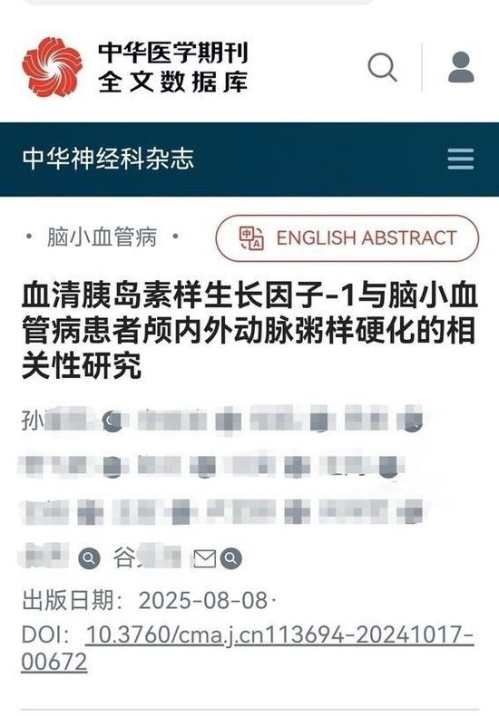 3月18日,针对孙同学的科研能力,封面新闻检索学术资料发现,孙同学曾以第一作者身份,在《中华神经科杂志》发表题为《血清胰岛素样生长因子-1与脑小血管病患者颅内外动脉粥样硬化的相关性研究》的文章,而其导师谷某某排名末尾。