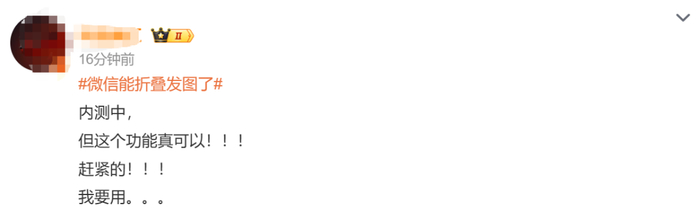 “微信能折叠发图了”的词条也登上微博热搜榜首位。