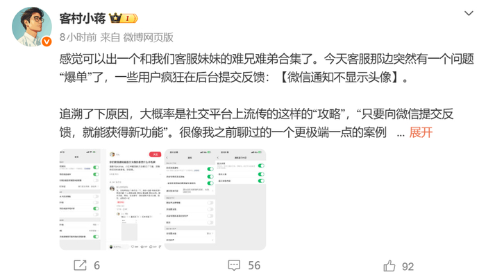 针对近期大量用户集中反馈“通知不显示头像”的问题,客村小蒋解释称,这可能与社交平台上流传的所谓“提交反馈即可开通新功能”的攻略有关,导致部分用户误以为通过反馈可以提前获取该功能,实际上,这只是时间上的巧合。