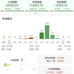 财联社3月19日电,市场全天震荡调整,三大指数均跌超1%,沪指盘中一度跌破4000点关口。沪深两市成交额2.11万亿,较上一个交易日放量649亿。盘面上,市场热点题材弱势轮动,情绪降至冰点,全市场近5000只个股下跌。从板块来看,绿电、算电协同概念逆势走强,东方新能、粤电力A、韶能股份、广安爱众、华电辽能涨停,珈伟新能触及20CM涨停。算力租赁概念反复活跃,美利云2连板,贵广网络、铜牛信息、利通电子涨停。油气概念表现活跃,国新能源、蓝焰控股、天壕能源、洪通燃气涨停。下跌方面,有色金属板块跌幅居前,威领股份、中金黄金、兴业银锡纷纷大跌。钢铁板块走弱,安阳钢铁触及跌停。截至收盘,沪指跌1.39%,深成指跌2.02%,创业板指跌1.11%。