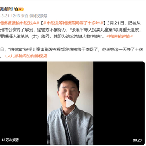 同日,“梅姨案”被拐儿童申聪发布视频称梅姨终于落网了,他说等这一天等了十多年。