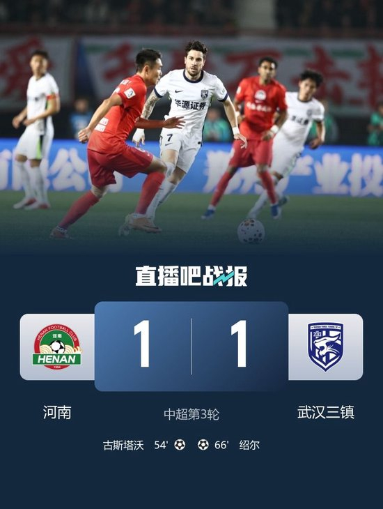 直播吧3月21日讯 中超第3轮,河南坐镇主场郑州航海体育场迎战武汉三镇。上半场,绍尔错失良机,方镜淇手指脱位后神扑。易边再战,古斯塔沃头槌破门+失绝杀,绍尔扳平比分。最终河南1-1三镇。积分榜方面,河南2胜1平积1分暂第八,三镇积负1分第十二。
