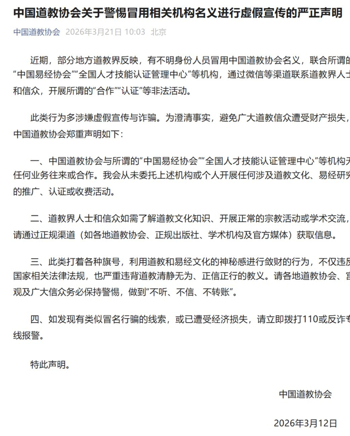 ·中国道教协会:从未委托所谓“中国易经协会”等机构开展涉及道教认证活动。