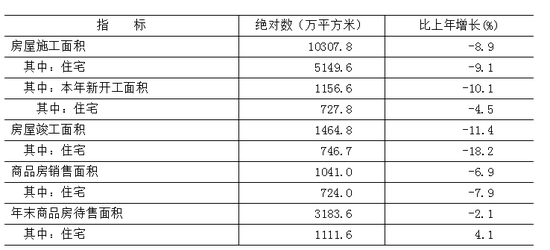 全年房地产开发投资比上年下降15.5%。全市房屋施工面积10307.8万平方米,比上年下降8.9%。其中,本年新开工面积1156.6万平方米,下降10.1%。全年房屋竣工面积1464.8万平方米,下降11.4%。全年新建商品房销售面积1041.0万平方米,下降6.9%。二手房交易网签面积[12]1682.7万平方米,增长0.9%。