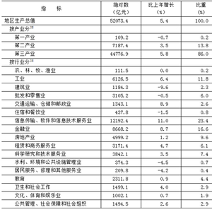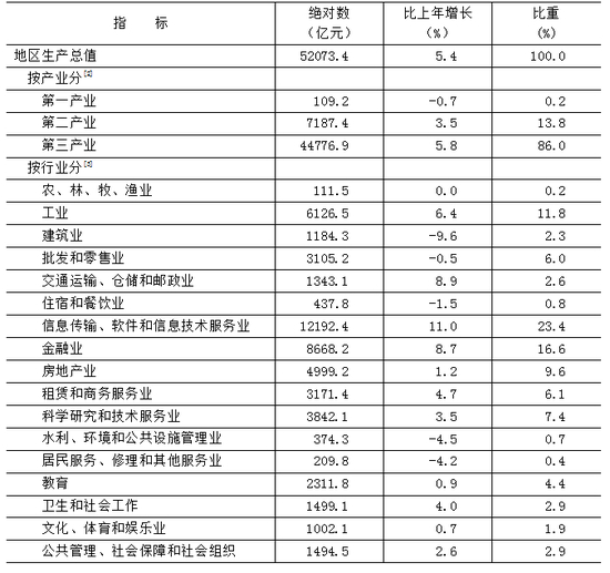 初步核算,全年实现地区生产总值52073.4亿元,按不变价格计算,比上年增长5.4%。其中,第一产业增加值109.2亿元,下降0.7%;第二产业增加值7187.4亿元,增长3.5%;第三产业增加值44776.9亿元,增长5.8%。三次产业构成为0.2︰13.8︰86.0。按常住人口计算,全市人均地区生产总值为23.9万元(按年平均汇率折算为3.3万美元)。