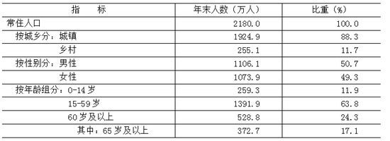 年末全市常住人口[4]2180.0万人,比上年末减少3.2万人。其中,城镇人口1924.9万人,占常住人口的比重为88.3%。常住人口出生率为5.55‰,死亡率为6.28‰,自然增长率为-0.73‰。全年城镇新增就业33.0万人,比上年增加3.1万人。城镇调查失业率均值为4.1%。