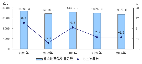 图5 2021—2025年社会消费品零售总额及增长速度