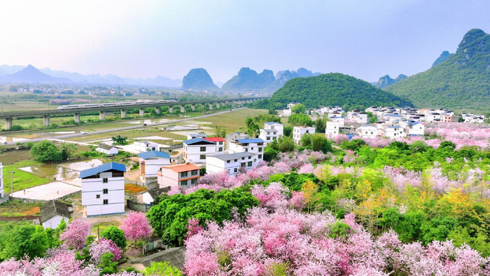 当洋紫荆染透柳州市柳江区成团镇龙山村的乡野,白墙民居便成了花海中的诗行。一列高铁从峰林与田畴间呼啸而过,载着满窗粉紫,开向春天,也开向乡村振兴的美好未来。(柳州市鱼峰区纪委监委供 陆介广/摄)