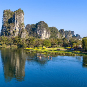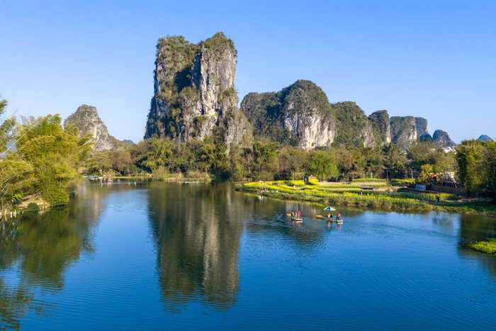 分明看见青山顶,船在青山顶上行。阳春三月,在阳朔县遇龙河,当澄澈的蓝天倒影在平静的河面,起伏的山峰和婆娑的树影水天一色,油菜花田里的一抹抹嫩黄,在春风里摇曳生姿,竹筏划破镜面,篙起篙落间,勾勒出一幅绝美的春日画卷。(阳朔县纪委监委供 夏立慧/摄)