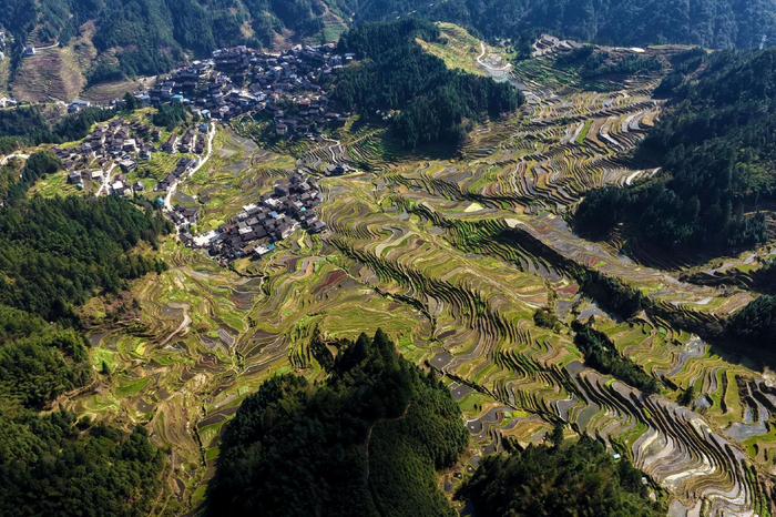 仲春时节,融水苗族自治县苗寨梯田水满田间,形如镜面,与连绵的群山、弯曲的公路、古老的吊脚楼相映成趣,构成了一幅美丽的春日生态画卷。(融水苗族自治县纪委监委 龙林智/摄)