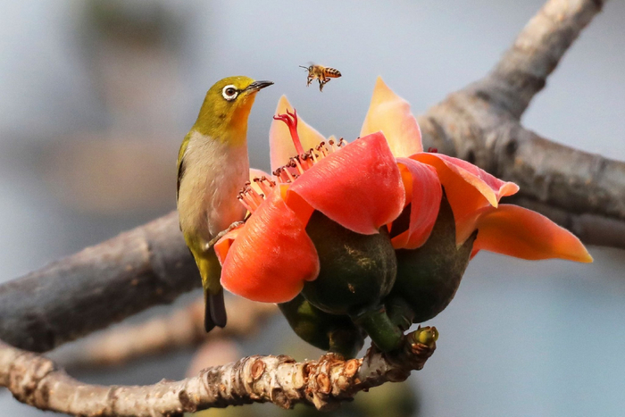 鸟语轻柔,春意和谐。一只黄羽亮眼的绣眼鸟俏立在鹿寨县鹿寨镇街道的木棉花边,一只嗡嗡忙碌的蜜蜂穿梭而来,皆化作春日里传达万物灵性、生机勃发的使者。(鹿寨县纪委监委供 肖秋明/摄)