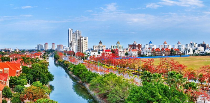 碧水蜿蜒穿城过,木棉似火燃街巷。晴空下,风格各异的楼宇参差林立,繁花与绿意相拥,绘就北海这座滨海之城的春日盛景。(北海市纪委监委供 吴泉/摄)