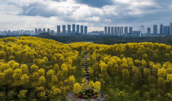 三月春风绽丽芳,千枝金蕊韵悠长。三月里,南宁市青秀山风景区连片的黄花风铃木迎来盛花期,金黄色的花朵儿夺人眼球,为春天增添了一抹靓丽的色彩。(宾阳县纪委监委供 曾祥忠/摄)