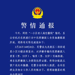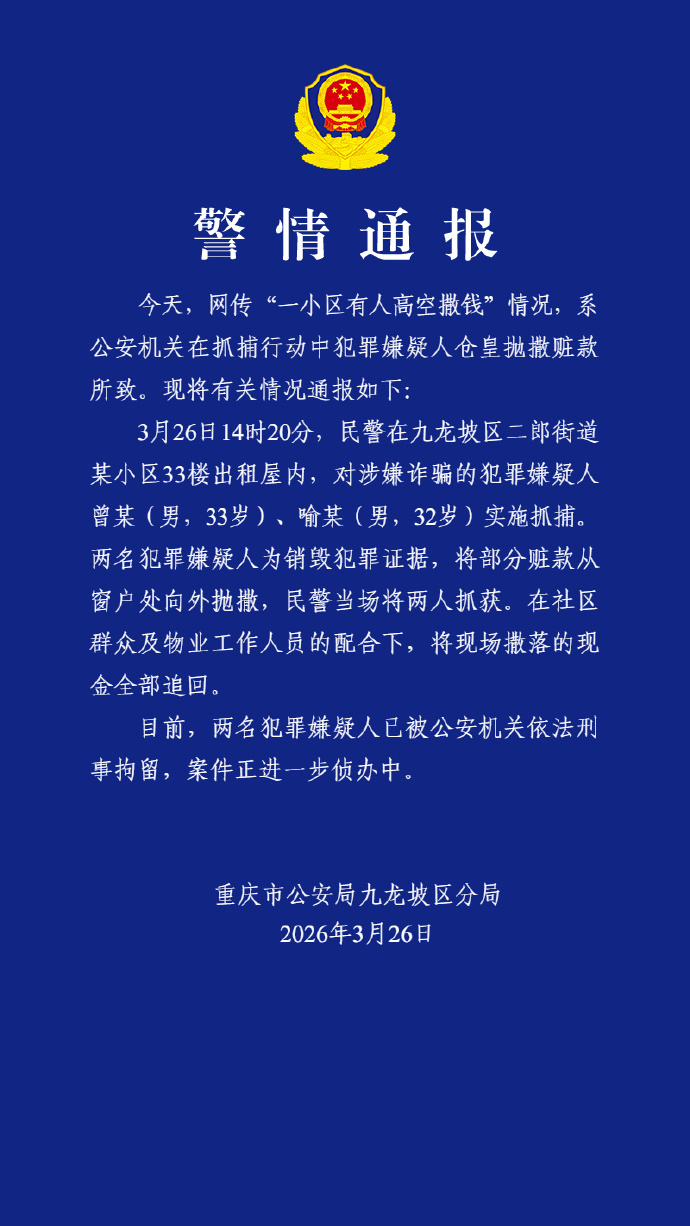 央视网消息:3月26日,重庆市公安局九龙坡区分局发布警情通报:今天,网传“一小区有人高空撒钱”情况,系公安机关在抓捕行动中犯罪嫌疑人仓皇抛撒赃款所致。3月26日14时20分,民警在九龙坡区二郎街道某小区33楼出租屋内,对涉嫌诈骗的犯罪嫌疑人曾某(男,33岁)、喻某(男,32岁)实施抓捕。两名犯罪嫌疑人为销毁犯罪证据,将部分赃款从窗户处向外抛撒,民警当场将两人抓获。在社区群众及物业工作人员的配合下,将现场撒落的现金全部追回。目前,两名犯罪嫌疑人已被公安机关依法刑事拘留,案件正进一步侦办中。