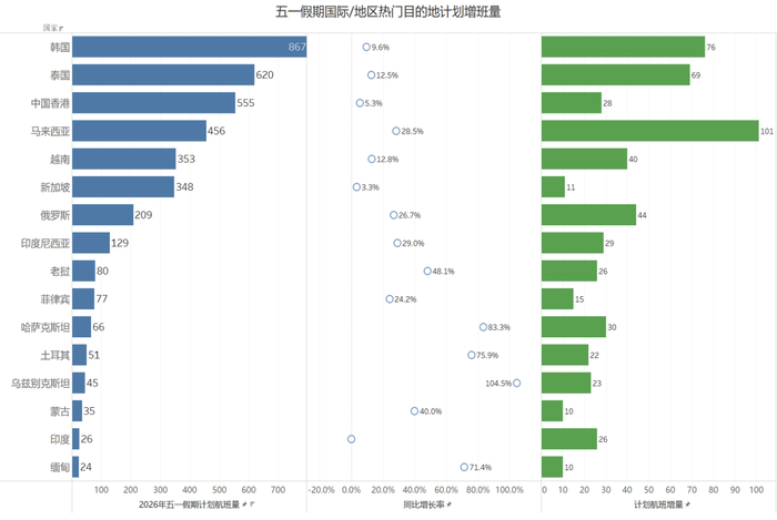 从计划航班量的整体来看,短程、高频、签证便利的目的地仍主导着“五一”假期的出行决策。据航班管家统计,2026年“五一”假期TOP20国家/地区中,韩国、泰国位居计划航班量前二;东南亚国家中,马来西亚、越南、新加坡保持稳定增长,其中马来西亚计划航班量同比增长28.5%。